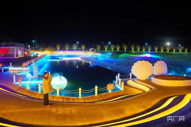 記者在現(xiàn)場看到,技術(shù)人員正緊張調(diào)試投影設(shè)備,水幕自湖面徐徐升起,畫面仿佛從水中“生長”而出。春節(jié)期間,整片尖山湖將化身天然巨幕,沉浸式水幕電影每晚準(zhǔn)時(shí)上演,激光、水霧、音效完美交融,帶來震撼視聽體驗(yàn)。