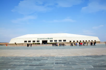 水洞溝遺址博物院,它的外形仿水洞溝出土的名為石核的石器建造而成,建筑面積4308平方米,水洞溝遺址博物院以雕塑、展板、投影、文物展出以及講解的形式,可以了解人類進化的起源、水洞溝文化的興起以及水洞溝遺址五次考古發(fā)掘的過程與成果,同時,還有12分鐘的動態(tài)演出,讓我們實景體驗三萬年前原始人生產(chǎn)、生活以及面臨山洪暴發(fā)、山崩地裂的災難時被迫遷徙的場景。