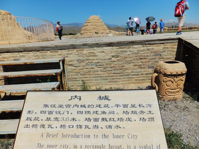 月城北側(cè)為內(nèi)城遺址,四面用神墻環(huán)繞,呈南北長方形,南北長180米,東西寬160米。占地約40畝。神墻中部較窄,靠近轉(zhuǎn)角漸寬大,純凈黃土分段夯筑而成,中部每段約3米,殘高約3米,比較平齊,各段如須彌座形狀。神墻四處轉(zhuǎn)角皆很高大,類圓柱形,從各轉(zhuǎn)角往神墻兩側(cè),連體圓柱愈來愈矮小,各有5個,共40個。其殘存最高達(dá)6米以上,最低的3米,發(fā)現(xiàn)在轉(zhuǎn)角處5個連體圓柱夯土臺周圍皆有磚瓦殘存。內(nèi)城四面神墻皆正中辟門,門址寬約12米,地面散布瓦片、脊飾殘塊等。根據(jù)統(tǒng)計(jì),內(nèi)城坍塌墻體在2002年時已達(dá)189.1米,約占墻體總長度的27.8%。南神門內(nèi)約25米偏西處有一處獻(xiàn)殿遺址。根據(jù)考古發(fā)掘情況看,可能原為一正方形臺基,臺面周長65米,直徑約20米,堆積厚約1米。臺基以純凈黃土墊起,其上及周圍殘存大量青磚灰瓦及琉璃構(gòu)件。獻(xiàn)殿之后約6米為墓道封土,南北長約42米,呈東南——西北走向,形似魚脊,以砂石填充。其末端為盜坑,盜坑直徑約20米,深約5米。坑內(nèi)長有若干小樹,兩側(cè)有土堆。內(nèi)城西北隅有一處陵臺,八角形,高約20米,分7級,每級向內(nèi)收分。陵臺收分處及周圍地面散布大量瓦片、瓦當(dāng)、滴水等建筑材料。夯土臺整體形狀為塔形,其上露出一個個椽洞,有水平方向的,還有豎斜方向的,證明原來有椽出頭。距離陵臺較遠(yuǎn)的四角各有一座角臺,其中東南、西南的兩座角臺已坍塌,西南角尚可分辨認(rèn)出臺基,相距約520米。其連線在雙闕臺之前,北面的2座角臺相距290米。東北角臺殘高1米多,坍塌嚴(yán)重,只有西北處的角臺保存比較完好,殘高約5米,但嚴(yán)重風(fēng)化。北邊兩角臺相距272米。南北聯(lián)線約460米。夯土臺因剝蝕已趨圓柱形,底面周長20米。純凈黃土夯筑,周圍散落著大量紅褐色板瓦、筒瓦殘片。