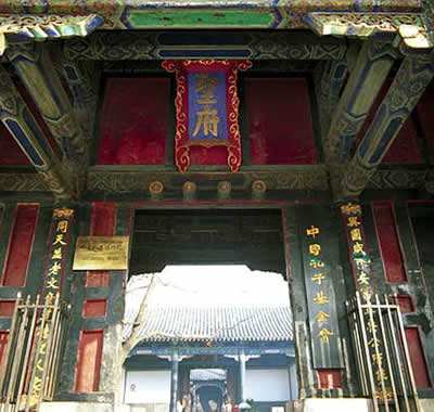 孔府位于曲阜城的中心,坐北朝南,迎面是一個粉白的大照壁,門前左右兩側(cè),有一對2米多高的圓雕雌雄石獅。紅邊黑漆的大門上鑲嵌著狻猊鋪首,大門正中上方的高懸著藍底金字的“圣府”匾額,門兩旁明柱上,懸掛著一對藍底金字對聯(lián):與國咸休安富尊榮公府第,同天并老文章道德圣人家。這副對聯(lián)相傳是清人紀(jì)均的手書。文佳字美,形象地說明了孔府在封建社會中的顯赫地位。這副對聯(lián)口氣之大自不待言,發(fā)人深思的是上聯(lián)“安富尊榮”的富字,下聯(lián)“文章道德”的章字,從上圖可以看出,“富”字上少了一 點,“章”字中多了一筆,意思是說衍圣公官職位列一品,田地萬