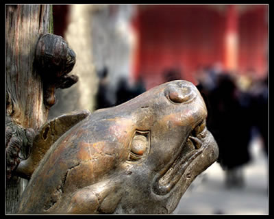 洙水橋北,先是一座綠瓦三楹的高臺(tái)大門(mén)——擋墓門(mén),后面就到了供奉孔子木主的享殿。去享殿的甬道旁,有四對(duì)石雕,名曰華表、文豹、角端、翁仲。華表系墓前的石柱,又稱望柱;文豹,形象似豹,腋下噴火,溫順善良,用以守墓;角端,也是一種想象的怪獸,傳說(shuō)日行1萬(wàn)8千里,通四方語(yǔ)言,明外方幽遠(yuǎn)之事;翁仲,石人像,傳為秦代驍將,威震邊塞,后為對(duì)稱,雕文、武兩像,均稱翁仲,用以守墓。兩對(duì)石獸為宋宣和年間所刻,翁仲是清雍正年間刻制的,文者執(zhí)笏,武者按劍。甬道正面是享殿,殿廣5間,黃瓦 歇山頂,前后廊式木架,檐下用重昂五踩斗栱。殿內(nèi)現(xiàn)存清帝弘歷手書(shū)“謁孔林酹酒碑”,中有“教澤垂千古,泰山終未頹”等詩(shī)句。解放戰(zhàn)爭(zhēng)時(shí),朱德總司令曾在此殿內(nèi)召開(kāi)過(guò)軍事會(huì)議。