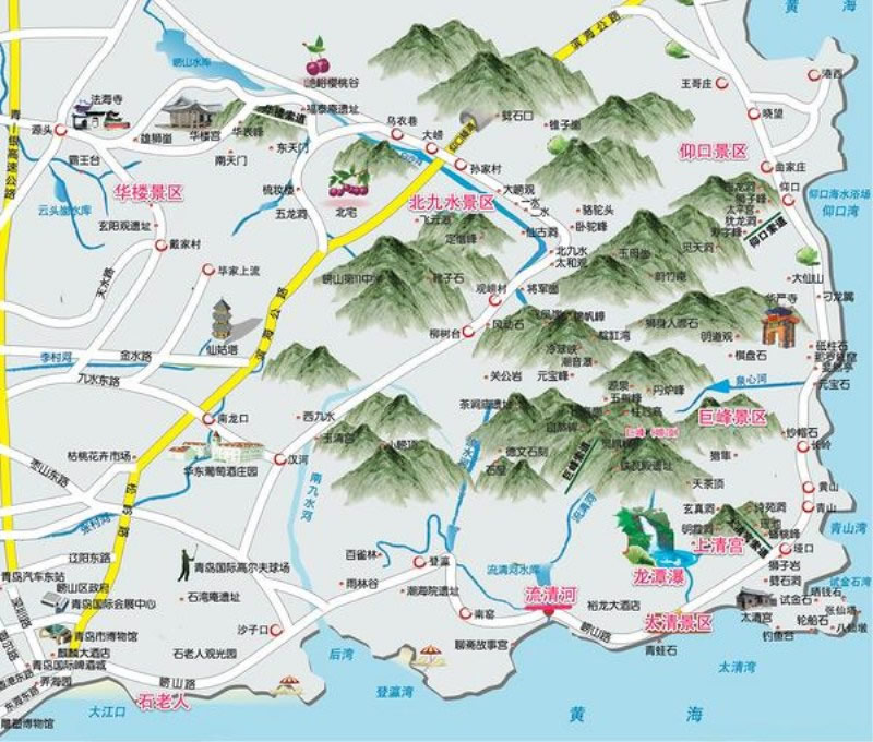 3、中線:也是由李滄區(qū)李村出發(fā),向東經(jīng)北龍口轉(zhuǎn)北,經(jīng)北宅,烏衣巷赴北九水景區(qū)。若時間允許,此線可于途中游覽華樓景區(qū);亦可驅(qū)車經(jīng)柳樹臺攀巨峰,步行過潮音瀑亦可達巨峰。由大嶗觀可轉(zhuǎn)赴仰口景區(qū)。