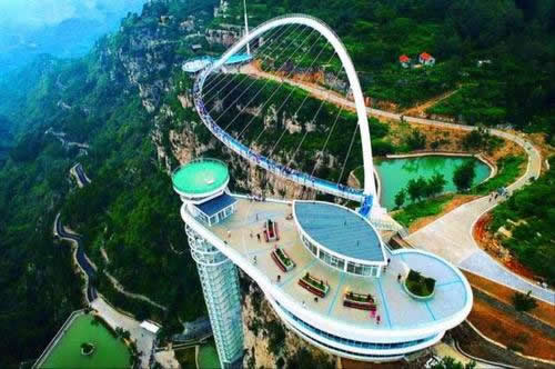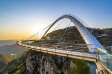 玻璃橋為無背索斜拉弧形玻璃橋,建于潭溪山海拔700米的崖壁之上,橋面跨度117米,懸空高度101米,外弧最大半徑90米,總承載可達900噸,單次承載10000人。玻璃橋整體由百米觀光電梯、懸崖酒店及玻璃橋體組成。其中,百米觀光電梯采用全景玻璃設計,依懸崖而建,集觀光、代步、游覽為一體。橋體的彩虹狀獨特造型,充滿動感與美感,且與山崖風格渾然一體。潭溪山高空玻璃橋迄今為止,潭溪山高空玻璃橋已獲得兩項國際大獎:2019年世界結(jié)構(gòu)大獎——行人橋梁獎,2020年國際橋梁大會(IBC)——亞瑟·海頓獎。