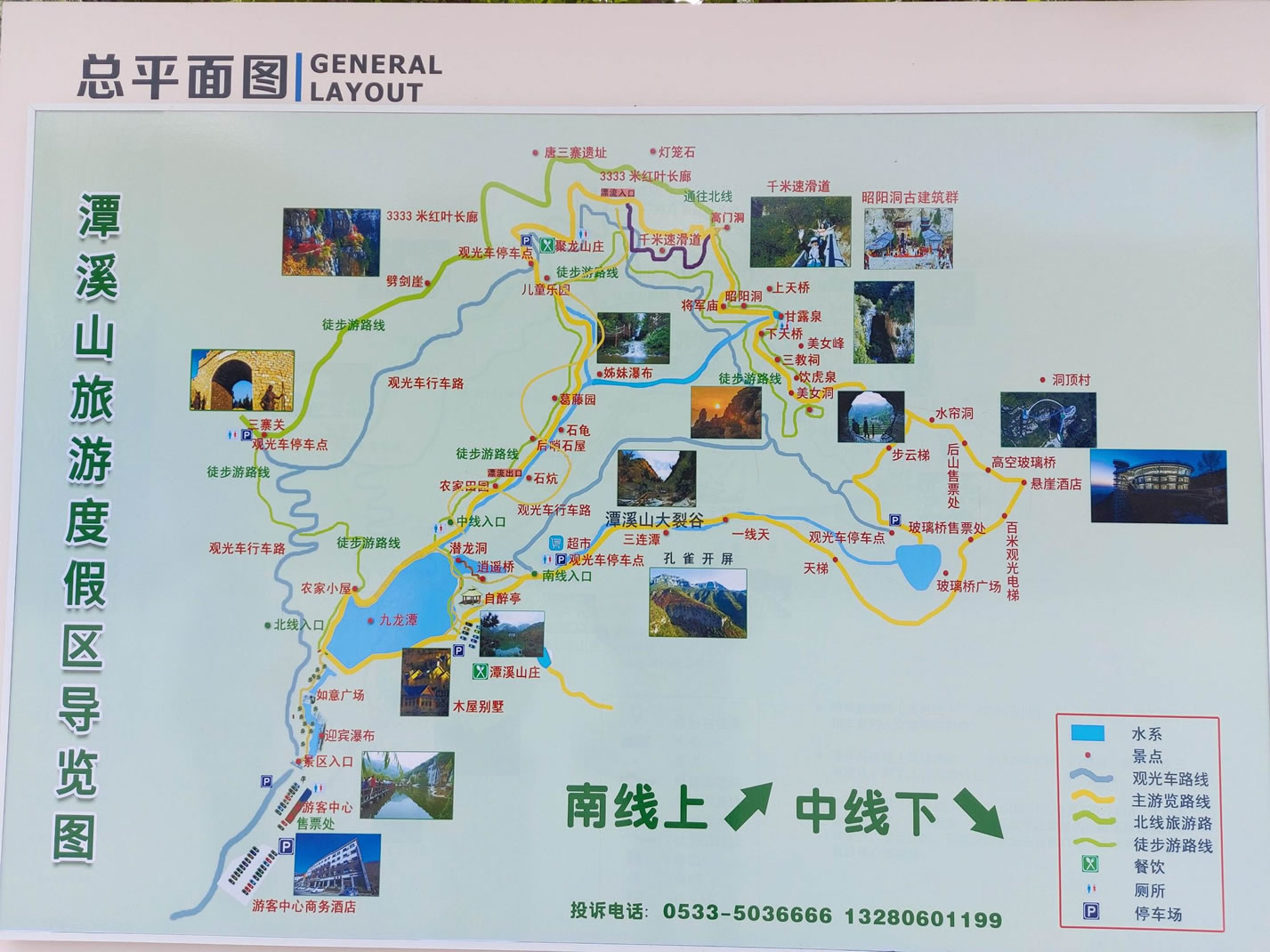 旅游中線:全程約1小時,以農(nóng)家風光、休閑娛樂為特色,主要景點有:潭溪山大瀑布、如意廣場、九龍?zhí)丁⑻断角f、自醉亭、潛龍洞、逍遙橋、潭溪山古酒坊、農(nóng)家田園、后哨石屋、櫻桃峪、神龜探路、姊妹瀑布、兒童撒野樂園、乘觀光車下山。 |