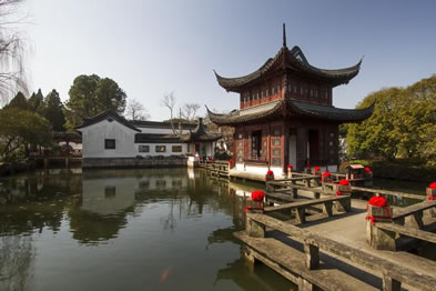紫菱洲為賈赦之女賈迎春的居所,因她在海棠詩社中號“菱洲”。這是兩座相同式樣的建筑,中間以七曲橋連接,兩端各有三曲橋。漲水時,曲橋平臥。