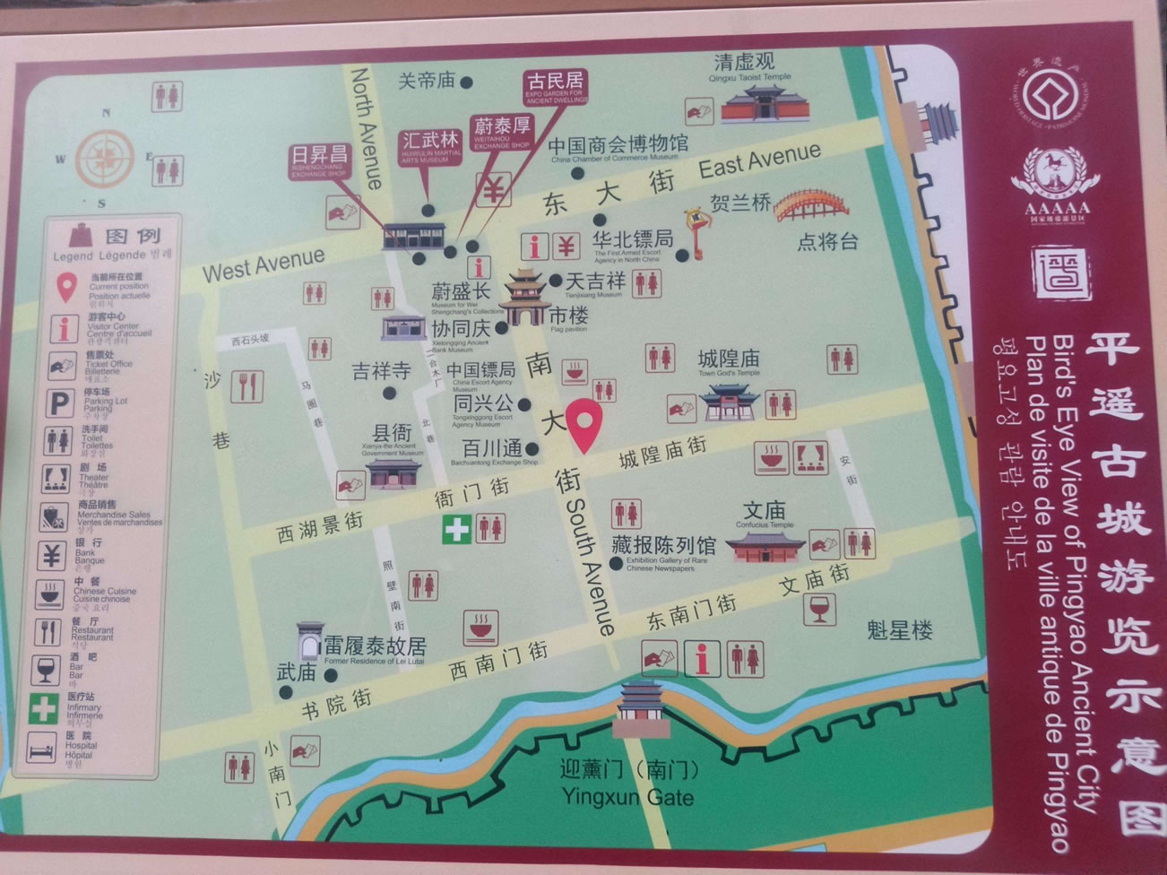 平遙古城素有“中國(guó)古建筑的薈萃和寶庫(kù)”之稱,文物古跡保存之多、品位之高實(shí)為國(guó)內(nèi)所罕見(jiàn)。其中有始建于西周,擴(kuò)建于明洪武3年(1370年),規(guī)模宏大,氣勢(shì)雄偉的國(guó)內(nèi)保存最完整的古城墻;有始建于北漢天會(huì)七年(963年)被列入我國(guó)第三位的現(xiàn)存最珍貴的木結(jié)構(gòu)建筑鎮(zhèn)國(guó)寺萬(wàn)佛殿。殿內(nèi)的五代彩塑堪稱珍品,是研究中國(guó)早期彩塑的樣本;有始建于北齊武平二年(571年)、被譽(yù)為“中國(guó)古代彩塑藝術(shù)寶庫(kù)”,現(xiàn)存宋元明清彩塑2052尊的雙林寺;有中國(guó)宋金時(shí)期文廟的罕見(jiàn)實(shí)物——文廟大成殿;有中國(guó)金融上的開(kāi)山鼻祖,被譽(yù)為“天下第一號(hào)”、“匯通天下”的“日升昌”票號(hào);有始建于唐顯慶二年,國(guó)內(nèi)古建筑中罕見(jiàn)的“懸梁吊柱”奇特結(jié)構(gòu)清虛觀。觀內(nèi)20余尊木雕神像是研究中國(guó)古代木雕造像藝術(shù)和道教發(fā)展的稀有之物;有遍布古城內(nèi)外1000通碑刻及年代不一、形式多樣、色彩續(xù)紛的各種琉璃實(shí)物。同時(shí),平遙古城是中國(guó)古代民居建筑的薈萃中心之一。古城內(nèi)現(xiàn)存4000處古、近代民居建筑中,有400余處典型地體現(xiàn)著中國(guó)古、近代北方民居建筑的風(fēng)格和特點(diǎn)。