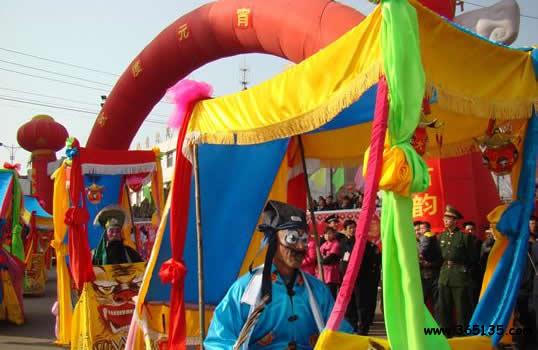 旱船:用竹條或木條制成船的模型,周圍用各色彩布遮蓋。表演者每人一船。以歷史或現(xiàn)代劇目為內(nèi)容,表演時,一人在船前劃船引導(dǎo),數(shù)人在后駕船,翩翩起舞,并變換各種隊(duì)形表演。東寨的旱船表演最為壯觀。