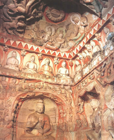 中期石窟:是云岡石窟雕鑿的鼎盛階段,主要有第1、2窟,第5、6窟,第7、8窟,第9、10窟,第11、12、13窟以及未完工的第3窟。這一時(shí)期即孝文帝太和年間(471-494年),是北魏遷洛以前的孝文時(shí)期,是北魏最穩(wěn)定、最興盛的時(shí)期,云岡石窟是集中了全國(guó)的優(yōu)秀人才,以其國(guó)力為保證,進(jìn)而雕鑿出更為繁華精美的云岡石窟大窟大像。因此從文成帝開(kāi)始云岡石窟皇家營(yíng)造大窟大像以曇曜五窟的興工為起始,經(jīng)獻(xiàn)文帝、馮太后,到孝文帝遷都,皇家經(jīng)營(yíng)的所有大窟大像均已完成,歷時(shí)40余年。中期洞窟平面多呈方形或長(zhǎng)方形,有的洞窟雕中心塔柱,或具前后室,壁面布局上下重層,左右分段,窟頂多有平棊藻井。造像題材內(nèi)容多樣化,突出了釋迦、彌勒佛的地位,流行釋迦、多寶二佛并坐像,出現(xiàn)了護(hù)法天神、伎樂(lè)天、供養(yǎng)人行列以及佛本行、本生、因緣和維摩詰故事等。佛像面相豐圓適中,特別是褒衣博帶式的佛像盛行,出現(xiàn)了許多新的題材和造像組合,側(cè)重于護(hù)法形象和各種裝飾。中期石窟也是積極于改革創(chuàng)新的時(shí)期,掀起了佛教石窟藝術(shù)中國(guó)化的過(guò)程。這多種因素的綜合,也就產(chǎn)生了所謂富麗堂皇的太和風(fēng)格,主要特點(diǎn)是漢化趨勢(shì)發(fā)展迅速,石窟藝術(shù)中國(guó)化在這一時(shí)期起步并完成,這個(gè)時(shí)期即云岡中期石窟,它所呈現(xiàn)的內(nèi)容繁復(fù)、雕飾精美的雕刻藝術(shù)特點(diǎn)大異于早期石窟,雕刻造型追求工整華麗,從洞窟形制到雕刻內(nèi)容和風(fēng)格均有明顯的漢化特征。