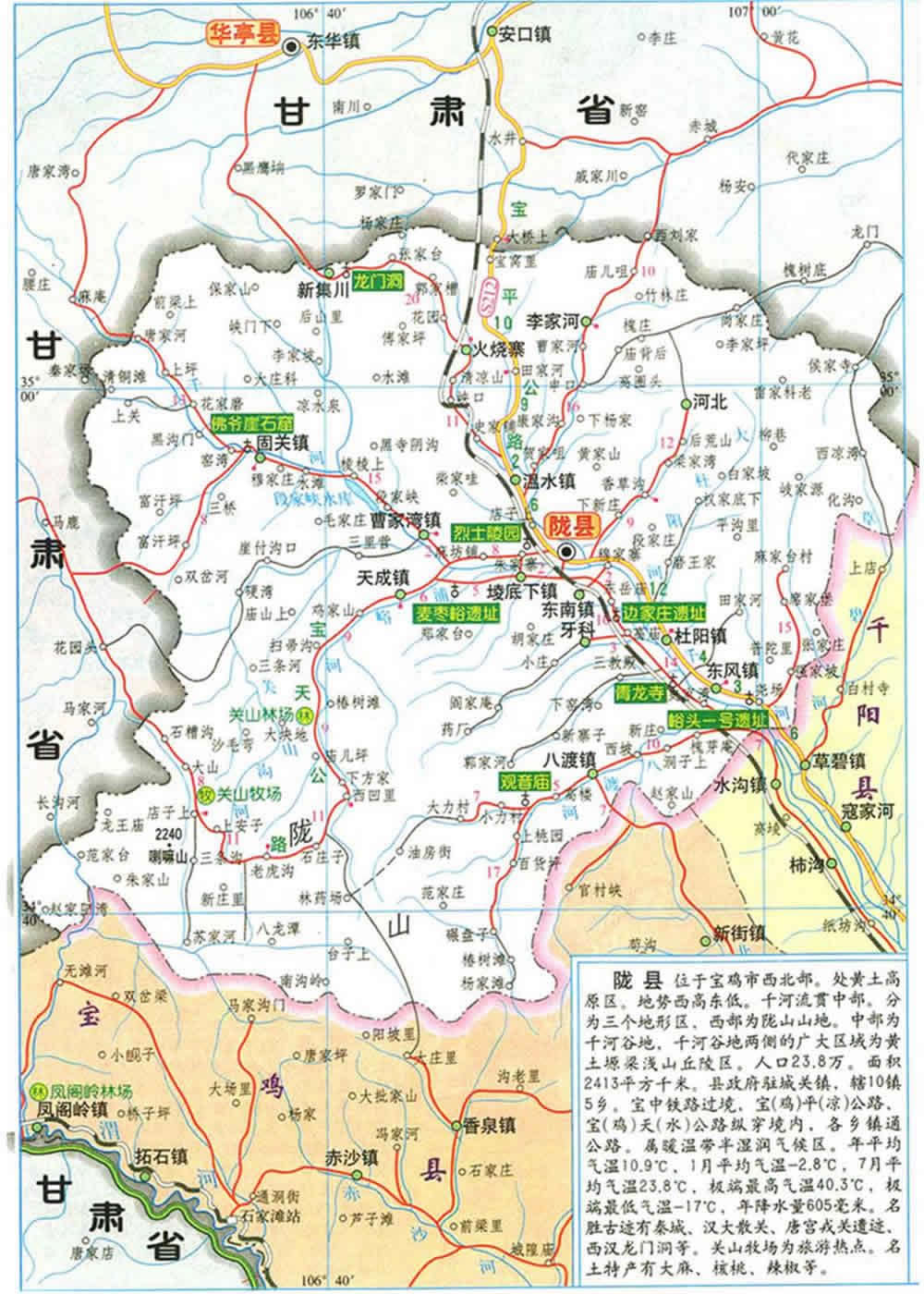 隴縣,史稱隴州,因地處隴山東阪而得名,是陜西省西部的一個邊陲縣。東臨千陽,南接陳倉,西北部與甘肅清水、張家川、華亭、崇信、靈臺五縣毗鄰。版圖面積 2418平方公里,轄10鎮(zhèn)5鄉(xiāng)1個管委會,158個行政村,1000個村民小組,總人口25.03萬,其中農業(yè)人口22.27萬。寶中鐵路和204省道貫穿全境,為陜、甘、寧“三省通衢”和邊貿重鎮(zhèn)。