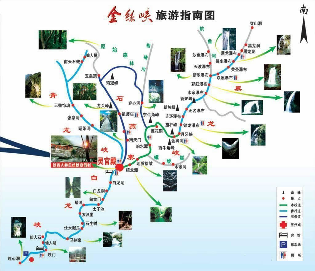 該景區(qū)還有以下觀賞景點(diǎn):翰墨崖,古藤、蝙蝠崖、懸棺、白龍門等。這里集奇花奇石奇湖于一體,有窄、長、秀、奇、幽的顯著特點(diǎn),中山地貌,峽谷開闊,眾多蘭草散生其間,號稱“秦嶺第一蘭花谷”。