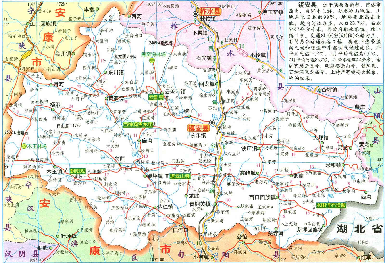 鎮(zhèn)安縣位于秦嶺東段南麓, 位于北緯33.8'至33.48"57',東經(jīng)108 34"35'至109 36"51'。距陜西省西安市195公里,離商洛市178公里。面積3487平方公里?h委、縣政府駐地永樂鎮(zhèn)(謝家彎)縣城前街188號。境內(nèi)最高點(diǎn)為楊泅鄉(xiāng)鷹嘴石,海撥2601.6米,最低點(diǎn)是龍勝鄉(xiāng)詢河村河谷,海撥344米,高低落差2257.6米,地勢西北向東南傾斜;屬長江水系漢江支流;年均降雨量804.4毫米,年平均氣溫12.2℃,屬亞熱帶半濕潤氣候。