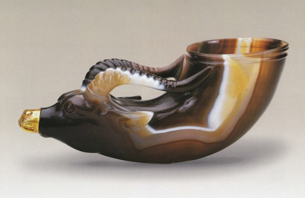酒器,長(zhǎng)15.5厘米,口徑5.9厘米。鑲金獸首瑪瑙杯選材精良,巧妙利用玉料的俏色紋理雕琢而成。杯體為角狀獸首形,獸雙角為杯柄。嘴部鑲金帽,眼、耳、鼻皆刻劃細(xì)微精確。從選材、設(shè)計(jì)到工藝,都可稱(chēng)為唐代玉雕藝術(shù)的精品,是迄今發(fā)現(xiàn)唐代唯一一件俏色玉雕,是唐代玉器做工最精湛的一件,也是唐代中外文化交流的產(chǎn)物。