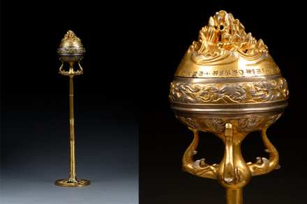 通高58厘米,口徑9厘米,底徑13.3厘米,重2.57公斤。高柄竹節(jié)豆形,蓋如博山,通體鎏金鋈銀,圈足底盤(pán)透雕兩蟠龍,均以頭承托盤(pán)腹,盤(pán)腹下部有十組三角形,內(nèi)雕飾蟠龍紋,龍首回顧,龍身從波濤中騰出,線(xiàn)條流暢,造型奇妙。爐口外側(cè)刻銘文一周135字。熏爐原為未央宮之物,后來(lái)被賞賜給漢武帝姊陽(yáng)信長(zhǎng)公主家。中國(guó)古代香爐,以漢晉間流行的博山爐最為精美,而此爐又為所見(jiàn)博山爐中最精美者,是古代罕見(jiàn)的藝術(shù)品。