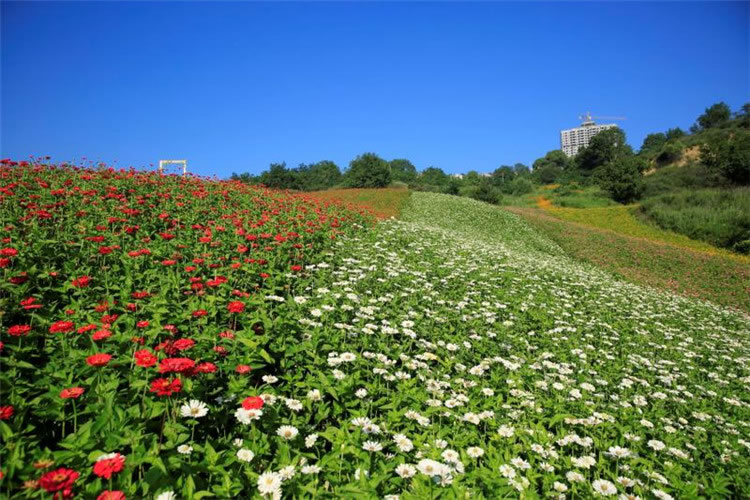 沿著小路拾級(jí)而上,百花爛漫,林木蔥郁,紅色的百日草、粉色的格;、紫色的薰衣草、嬌艷欲滴的虞美人、絢麗多姿的醉蝶......從山谷中傾瀉而下,如同一條彩色的小溪,置身其中,好似沉浸于花香鳥語(yǔ)的蝴蝶一般翩翩起舞、流連忘返。