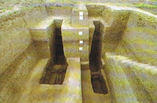 墓地東、西、北部均有圍溝環(huán)繞,形成長321、寬273米南部敞開的南北向長方形墓園。墓葬群位于墓園正中偏北,墓地中軸延長線正南500米處為呂氏家廟“呂氏莊閣云寺”故址。墓葬排列脈絡(luò)清晰,中軸線上自南向北縱向貫魚式為長子長孫系列,橫向則按輩份分排布置。墓地使用時(shí)間為宋神宗熙寧七年(公元1074年)至徽宗政和元年(公元1111年),共計(jì)埋葬五代呂氏族人。