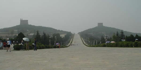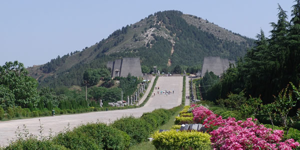 乾陵,是中國乃至世界上獨(dú)一無二的一座兩朝帝王、一對夫妻皇帝合葬陵。里面埋葬著唐王朝第三位皇帝高宗李治和中國歷史上唯一的女皇帝武則天,是全國重點(diǎn)文物保護(hù)單位。建于公元684年,歷時(shí)23年才修建完成。乾陵修建于公元684年,經(jīng)過23年的時(shí)間,工程才基本完工。氣勢雄偉壯觀。乾陵位于陜西咸陽市乾縣城北6公里的梁山上。梁山是圓錐形石灰?guī)r山體,共有三峰,北峰最高,海拔1047.9米,乾陵就在北峰之上。梁山南面兩峰較低,東西對峙,中間為司馬道,故而這兩峰取名叫“乳峰”。據(jù)史書記載,陵墓原有內(nèi)外兩重城墻,四個(gè)城門,還有獻(xiàn)殿闕樓等許多宏偉的建筑物?碧奖砻鳎簝(nèi)城總面積240萬平方米。城墻四面,南有朱雀門,北有玄武門,東有青龍門,西有白虎門。從乾陵頭道門踏上石階路,計(jì)537級臺(tái)階,其臺(tái)階高差為81.68米。走完臺(tái)階即是一條平寬的道路直到“唐高宗陵墓” 碑,這條道路便是“司馬道”。兩旁現(xiàn)有華表1對,翼馬、鴕鳥各1對,石馬5對,翁仲10對,石碑2道。東為無字碑,西為述圣記碑。有王賓像61尊,石獅1對,周圍還有17座陪葬墓。“唐高宗陵墓”墓碑,高2米,是陜西巡府畢源為高宗所立,原碑已毀,現(xiàn)在這塊碑是清乾隆年間重建的。此碑右前側(cè)另一塊墓碑,是郭沫若題寫的“唐高宗李治與則天皇帝之墓”12個(gè)大字。另外在南門外有為高宗皇帝和武則天歌功頌德的《述圣記碑》和《無字碑》二通以及參加高宗葬禮的中國少數(shù)民族首領(lǐng)和友好國家使臣的石刻像六十一尊。在中國歷史上,陵前石刻的數(shù)目、種類和安放位置是從乾陵開始才有了固定制度的,一直延襲到清代,歷代大同小異。