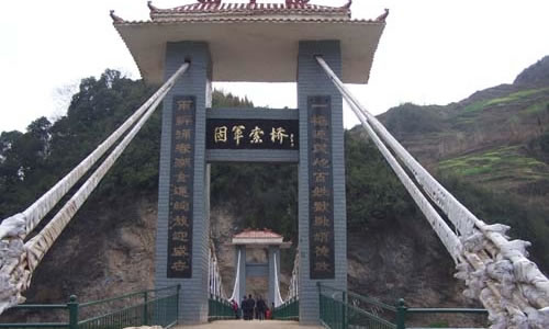 固軍索橋 萬源市固軍鄉(xiāng)中河村是萬源市2005年“7.8”洪災(zāi)的重災(zāi)村,洪災(zāi)沖毀中河村原有鋼絲橋致中河兩岸2900余人無法過河、運(yùn)輸。固軍中河索橋建設(shè)工程得到省以工代賑辦大力支持并被列為2005年省管重點(diǎn)項(xiàng)目,主體工程投資30萬元,其中國家投入以工代賑資金15萬元,下差資金由當(dāng)?shù)卣腿罕娮曰I解決。該工程由萬源市交通局設(shè)計(jì)施工圖紙并負(fù)責(zé)技術(shù)監(jiān)管,橋設(shè)計(jì)為鋼筋混凝土斜拉索橋,全長95延米,寬3.5米,可承受5噸以下的微型車輛通行。