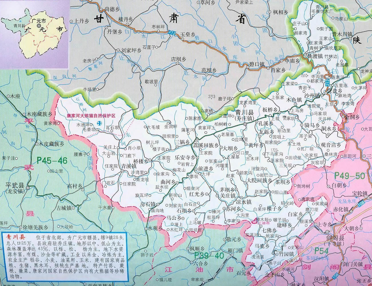 青川縣轄9個鎮(zhèn)、25個鄉(xiāng)、2個民族鄉(xiāng)、1個國家級自然保護區(qū):
