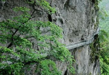 樂山大佛右側(cè)的石壁上,有一條險峻的棧道,自上而下盤旋九曲,這便是“九曲棧道”,是與修建佛像同時開鑿的。 棧道頂端有一長廊式亭閣,棧道第一折的經(jīng)變圖雕刻精細,并刻有樓臺亭塔,是研究唐代建筑和石刻藝術(shù)的寶貴資料。