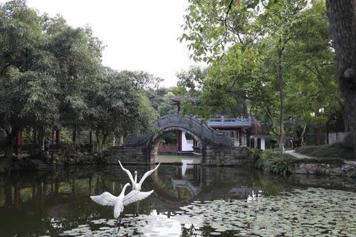 過蓮池旁的“山谷小憩”,亦為園中一景。其間,黃庭堅身著便裝,手拿書卷,在池旁靜坐沉思。兩只白鶴立于水中相伴,此景也稱“雙鶴伴涪翁”,優(yōu)雅清新,寓味深長,形象地表現(xiàn)了黃庭堅在謫居戎州時,平和豁達的心態(tài)。