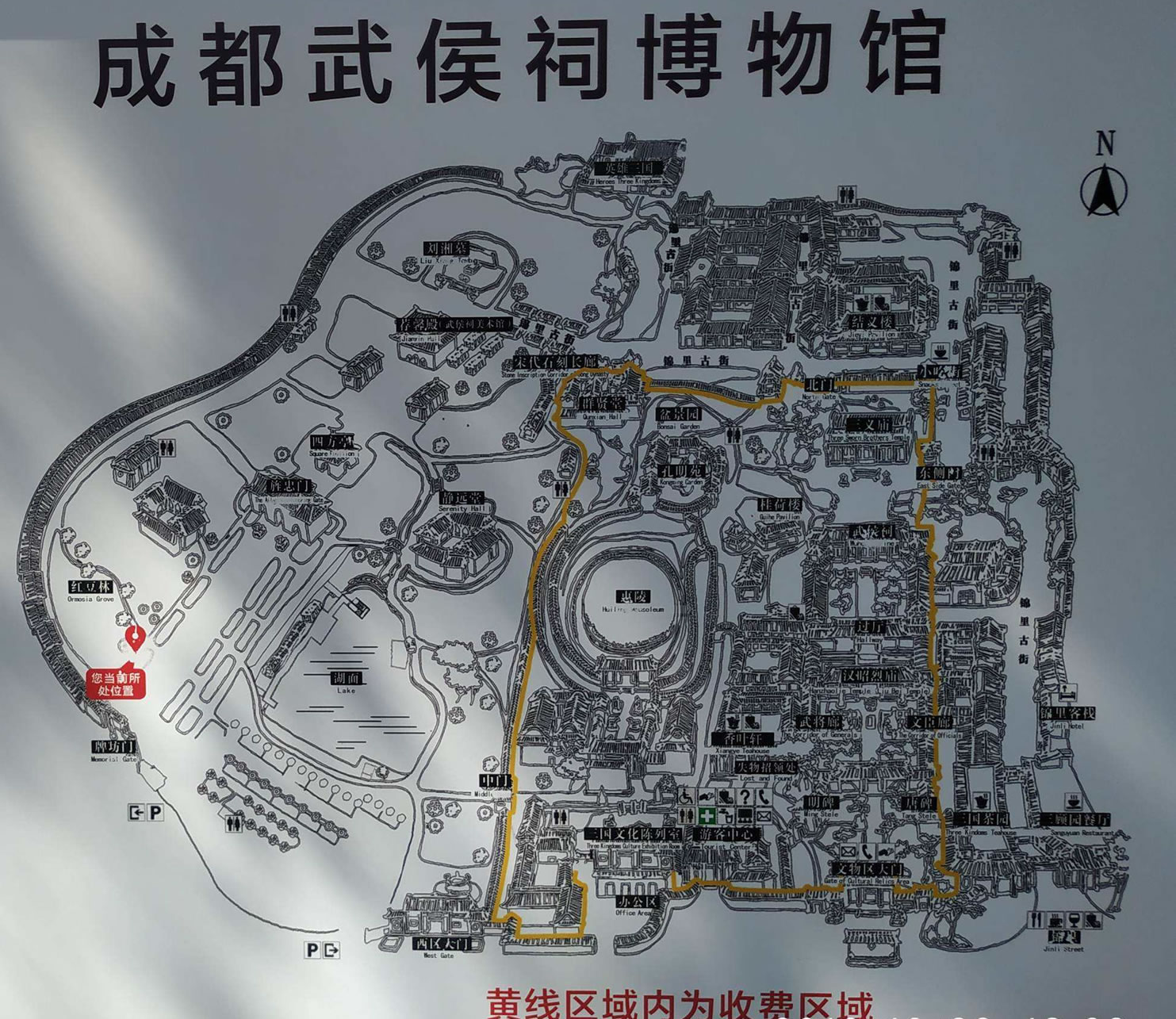 成都武侯祠博物館現(xiàn)分為三國歷史遺跡區(qū)(文物區(qū))、西區(qū)(三國文化體驗(yàn)區(qū))、錦里民俗區(qū)(錦里)三大板塊,面積15萬平方米。整個武侯祠坐北朝南,占地面積五十六畝(37000平方米),祠內(nèi)翠柏森森,殿宇重重,布局嚴(yán)謹(jǐn),莊嚴(yán)肅穆。成都武侯祠主體建筑大門,二門,劉備殿,過廳,武侯祠五重,嚴(yán)格排列在從南到北的一條中軸線上,西側(cè)是劉備陵園及其建筑。二門至劉備殿與東西殿、過廳至諸葛亮殿與東西兩廂房,形成兩組四合建筑結(jié)構(gòu)。軸線建筑兩側(cè)配有園林景點(diǎn)和附屬建筑。 跨進(jìn)漢昭烈廟,從大門到二門之間可見六通石碑聳立一道路。