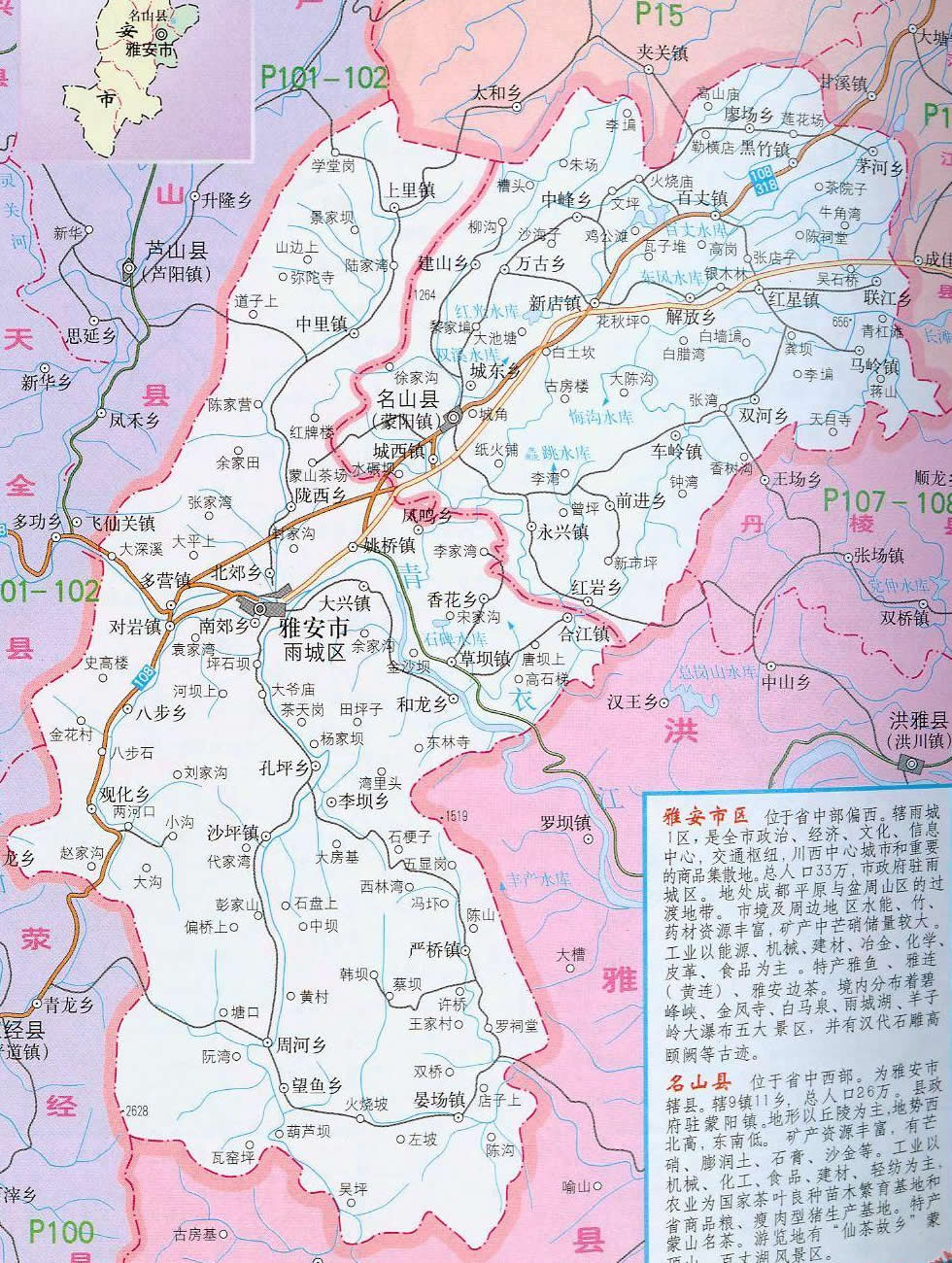 鎮(zhèn):蒙陽鎮(zhèn)、百丈鎮(zhèn)、車嶺鎮(zhèn)、永興鎮(zhèn)、馬嶺鎮(zhèn)、新店鎮(zhèn)、黑竹鎮(zhèn)、紅星鎮(zhèn)、蒙頂山鎮(zhèn)