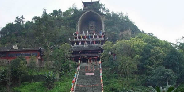榮縣大佛:榮縣城東0.5公里有全國(guó)第二大佛——榮縣大佛,大佛寺內(nèi)半山之上,有一尊巍峨的石刻如來(lái)坐佛佛像,世稱榮縣大佛。大佛依山崖鑿成,通高36.67米,頭長(zhǎng)8.76米,肩寬12.67米,膝高12米,腳寬3.5米,其頭部長(zhǎng)8.76米,肩寬12.67米,腳寬3.5米。是一尊如來(lái)佛像,僅次于樂(lè)山彌勒大佛,為中國(guó)第二石刻大佛!s縣大佛開鑿于北宋元豐八年(公元1085年),完工于公元1092年,歷時(shí)八年始完工。大佛的頭頂上方有一道石條卷拱護(hù)罩,上刻“大開覺(jué)路”四字;崖頂上還有磚閣一座,遠(yuǎn)看像在戴在大佛頭頂上的寶冠。 大佛鑿刻完工后,即修有殿宇保護(hù),根據(jù)《古今圖書集成》記載,時(shí)有“架殿十層,高四十七丈,闊十五丈”、“舊時(shí)寺門、抵今溪岸”?梢姰(dāng)時(shí)的恢宏氣勢(shì),其后幾毀幾修,現(xiàn)存的殿宇為清代嘉慶、道光年間所建。1988年重建的大佛護(hù)身樓,是仿木仿古重檐歇山式建筑,既保護(hù)了大佛,又具游覽價(jià)值,逐層登樓近瞻佛容慈顏,從上到下盡觀大佛偉岸雄姿,鳥瞰榮城風(fēng)貌,眺望遠(yuǎn)山近巒。