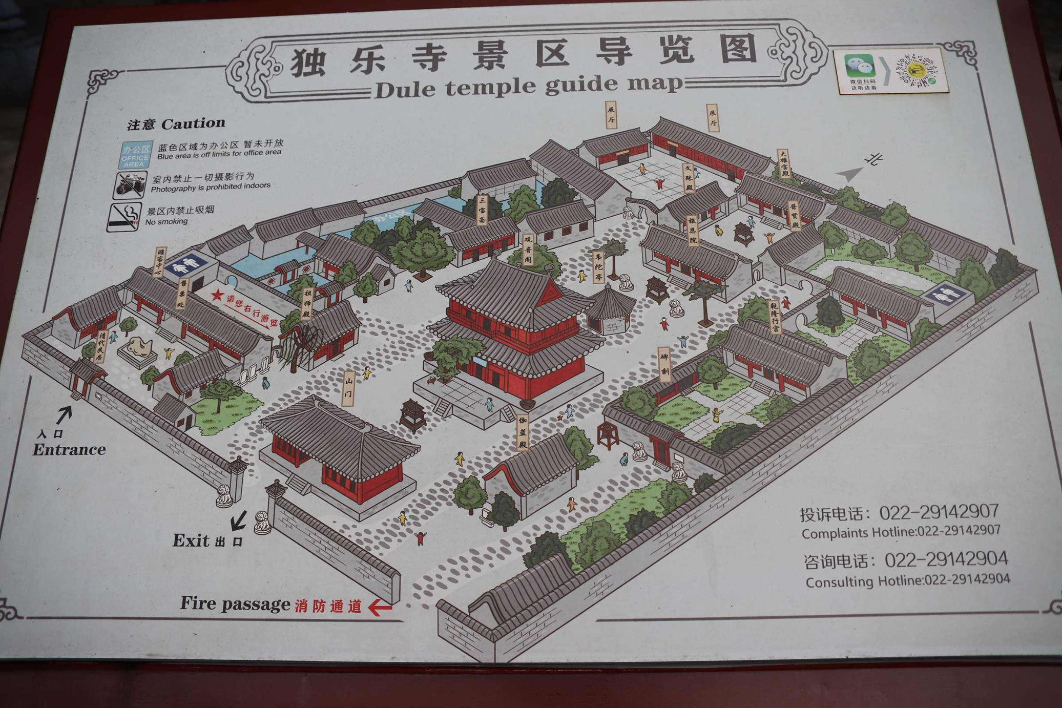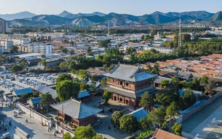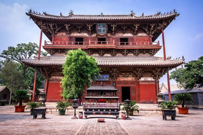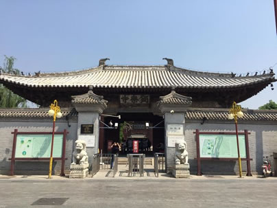 獨(dú)樂寺山門是我國現(xiàn)存最早的廡殿頂山門,山門面闊三間,進(jìn)深兩間,中間做穿堂,正脊兩端的鴟吻,造型生動古樸為,遼代原物。