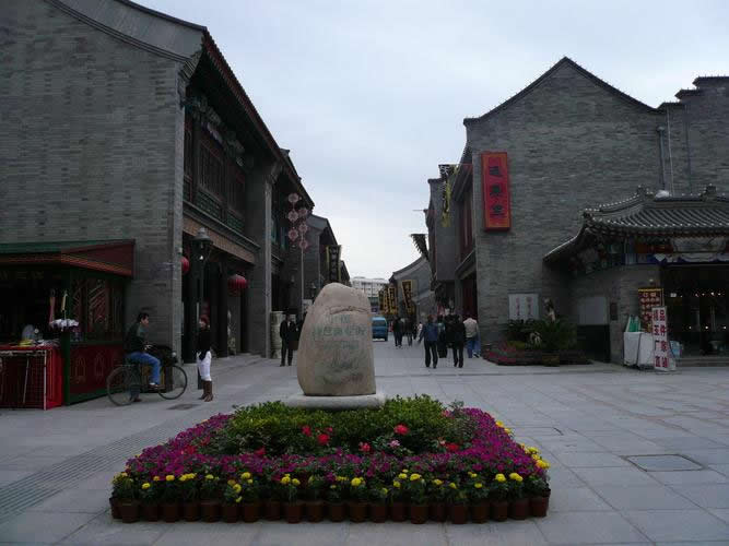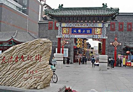 天津古文化街于一九八六年元旦建成開(kāi)業(yè),整體建筑為仿清民間式建筑風(fēng)格,天后宮(媽祖廟)位于全街的中心。全街近百家店堂,有經(jīng)營(yíng)天津地方特色的楊柳青年畫(huà)的楊柳青畫(huà)社,經(jīng)營(yíng)泥人彩塑的泥人張彩塑工藝品經(jīng)營(yíng)部,有經(jīng)營(yíng)文房四寶,名人字畫(huà)的四寶堂,春在堂,有經(jīng)營(yíng)文物古玩的文物公司萃文齋門(mén)市部,還有經(jīng)營(yíng)全國(guó)各地的景泰藍(lán),雙面繡,牙玉雕,藝術(shù)陶瓷,中西樂(lè)器金銀飾品等上萬(wàn)種名優(yōu)工藝品的幾十家店堂,各種商品貨真價(jià)實(shí),物美價(jià)廉,商家以質(zhì)量和信譽(yù)吸引中外游客。