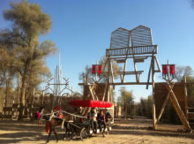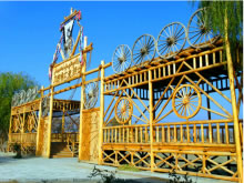 風格獨特、氣勢宏偉的大門就是刀郎人民俗村寨門。造型似刀郎人英雄男兒形象,體現(xiàn)刀郎人的勇敢彪悍、不屈不撓、勤勞智慧、熱愛子民的硬漢精神。