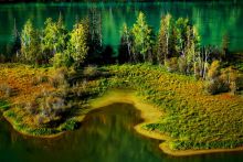 變色湖位于喀納斯湖中央。春夏時(shí)節(jié),湖水會隨著季節(jié)和天氣的變化而變換顏色。從每年的四五月間開化到11月冰雪封湖,湖水在不同的季節(jié)呈現(xiàn)出不同的色彩。5月的湖水,冰雪消融,湖水幽暗,呈青灰色;到了6月,湖水隨周山的植物泛綠,呈淺綠或碧藍(lán)色;7月以后為洪水期,上游白湖的白色湖水大量補(bǔ)給,由碧綠色變成微帶藍(lán)綠的乳白色;到了8月湖水受降雨的影響,呈現(xiàn)出墨綠色;進(jìn)入9、10月,湖水的補(bǔ)給明顯減少,周圍的植物色彩斑斕,一池翡翠色的湖水光彩奪目。