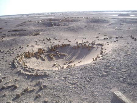 位于孔雀河古河道北岸。它是1979年冬被考古學(xué)家侯燦、王炳華等所發(fā)現(xiàn),古墓有數(shù)十座,每座都是中間用一圓形木樁圍成的死者墓穴,外面用一尺多高的木樁圍成7個圓圈,并組成若干條射線,呈太陽放射光芒狀。經(jīng)碳14測定,太陽墓已有3800年之久。