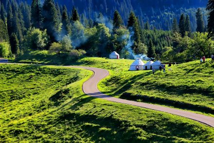 位于河谷草原線路、冰河景觀道、盤龍谷道的十字路口,由烏孫古部落、連心湖、哈薩克民俗文化展示區(qū)及牛欄餐吧組成,是哈薩克族民俗文化的集中展示區(qū),可親身體驗(yàn)參與哈薩克族豐富多彩的生產(chǎn)生活,盡享草原民俗風(fēng)情的淳樸謙和。走出依提更塞民俗體驗(yàn)區(qū),向西穿過天光云影共徘徊的連心湖,就到了草木掩映中的“烏孫部落”。這里反映著哈薩克族原始的生活場景,沿著山林、草原、河岸,山水之遇。