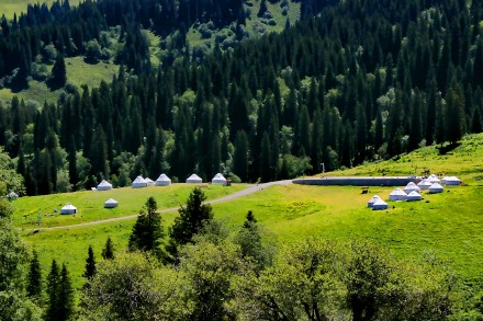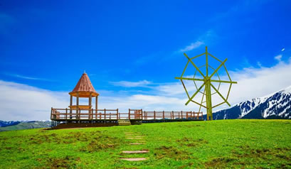 哈薩克語為草原會客廳,是古時候草原民族商量重大事宜的地方,現(xiàn)為景區(qū)河谷草原線路的綜合服務(wù)區(qū)?晒┯慰腕w驗(yàn)騎馬、射箭、民族服裝留念、古道馬車、草地摩托車、住宿、直升機(jī)觀景等娛樂項(xiàng)目、餐以及住宿服務(wù)。