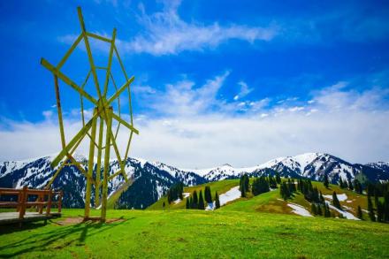 哈薩克語為“美麗的山溝”,是進(jìn)入河谷草原的第一站,擁有一山四景,白雪皚皚的山峰、茂密的森林、連綿起伏的山丘、平坦的草甸,是草原垂直自然景觀帶的窗口。其東側(cè)的山坡形似天山母親的耳朵,聆聽著大地的聲音,默默守護(hù)著天山,被稱之為“天山之耳”。西南側(cè)的山坡形似一匹昂首奔騰的駿馬,見者“馬到成功,飛黃騰達(dá)”被取名為“飛馬坪”。