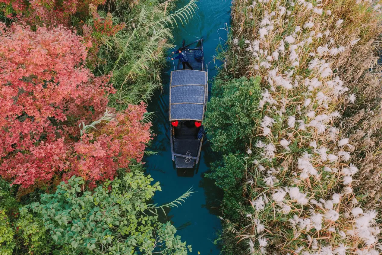 秋日的常熟沙家浜國家濕地公園,蘆葦蕩褪去青翠,換上了金棕色,白鷺掠過波光粼粼的湖面,幾條游船靜靜穿行在蘆葦迷宮中,船頭游客相機的咔嚓聲,交織成對這片“綠水青山”的贊美。