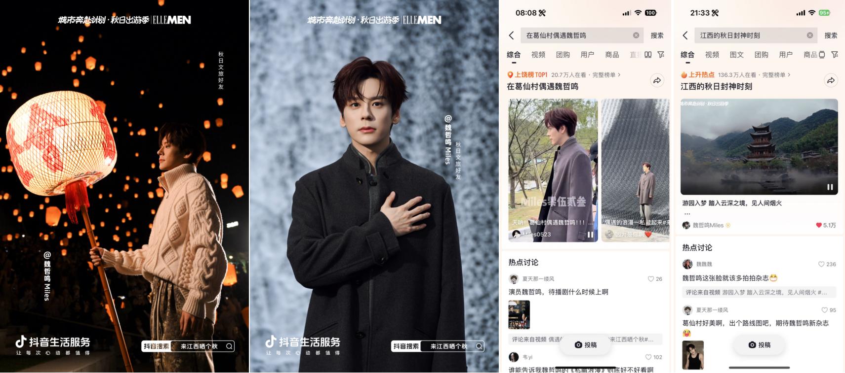 抖音牽手“秋日男友”魏哲鳴前往江西上饒葛仙村拍攝文旅宣發(fā)視頻引發(fā)廣泛關注,路透內容#在葛仙村偶遇魏哲鳴 登上上饒同城榜TOP1;主視頻發(fā)布后,#江西的秋日封神時刻 更登頂同城榜及全國種草榜TOP6;顒舆與綜藝《今晚組個局》實現(xiàn)聯(lián)動,吳昕、代露娃、郭俊辰、何洛洛等明星演員前往上饒拍攝定制化文旅內容,#上饒葛仙村千燈會偶遇明星 #何洛洛代露娃上饒葛仙村浪漫赴約 等路透內容與節(jié)目看點登頂上饒同城榜TOP1,#組局團在上饒千燈會一起祈愿 搶占同城榜TOP2。明星效應有效激發(fā)用戶出行意愿,葛仙村交易額同比403%顯著增長,持續(xù)引爆目的地&商家出圈。