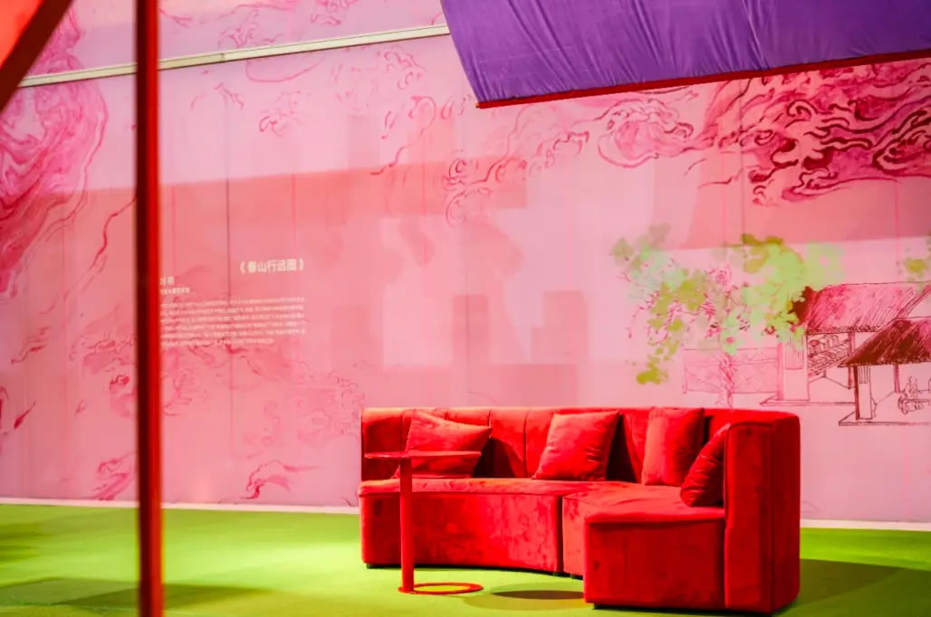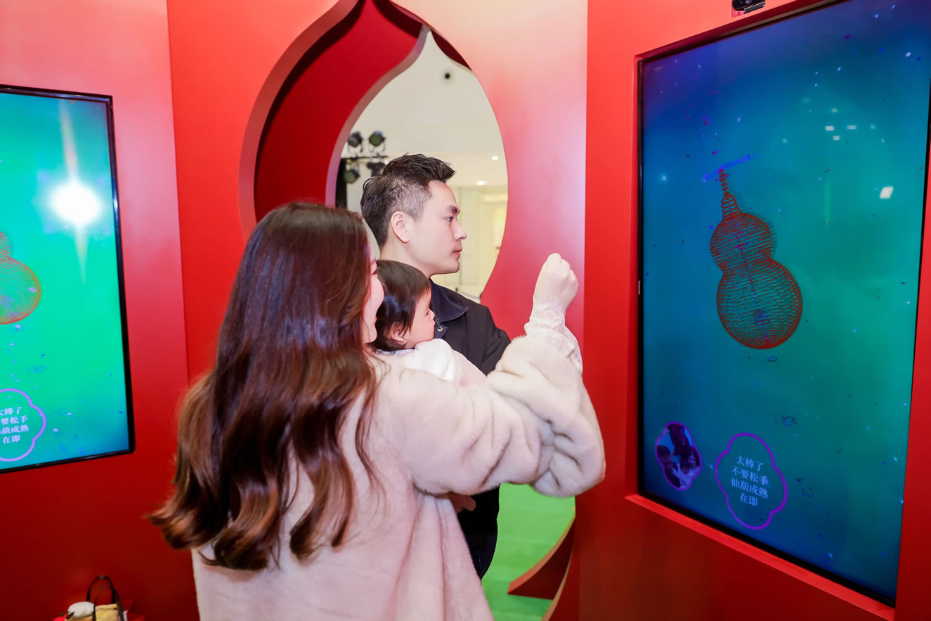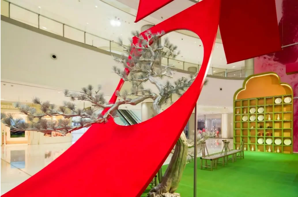 山水,并非遠行才可得見。書法水墨藝術(shù)家劉玥首展作品《春山行遠圖》以20米巨幅“山水開卷”,步入其中,與天地春意從容照面;紅色的帷幔落于銀色的松枝上,就像于山間松下靜謐的一隅,“幕下棲心”將是絕佳開年時尚大片的打卡處;松下銀椅,為你與摯友“漫敘往來”的相聚時刻營造出寧靜、松弛的氛圍;多寶閣中陳列著未經(jīng)雕琢的茶器素胚與場內(nèi)品牌萬仟堂,長沙尼依格羅酒店及tea'stone帶來的新春茶器,以“初芒蘊能”詮釋著未來的無限可能與新生力量。轉(zhuǎn)身與“蒔光種愿” 四方亭相遇。葫蘆門朝四方而開,寓意著納四方福祿,步入其中,與數(shù)字交互藝術(shù)家吳旭首展作品《無限福祿》體驗互動,跟隨指引揮動手勢,觸發(fā)粒子凝聚為動態(tài)“福”字,親手完成一場新春祈福儀式。我們把象征團圓與喜悅的紅色沙發(fā)打造“盞間聚暖”,如懷抱般圍合的布局作為“歸處”的隱喻。與家人團聚便是心歸處,這將是中國年最圓滿的意象。