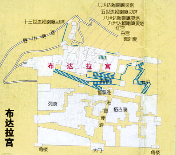 布達(dá)拉宮的基本面貌,主要是公元17世紀(jì)五世達(dá)賴(lài)?yán)飼r(shí)期重建的白宮及其圓寂后修建的紅宮,“此后歷代達(dá)賴(lài)又相繼擴(kuò)建,終成布達(dá)拉宮今日之規(guī)模!