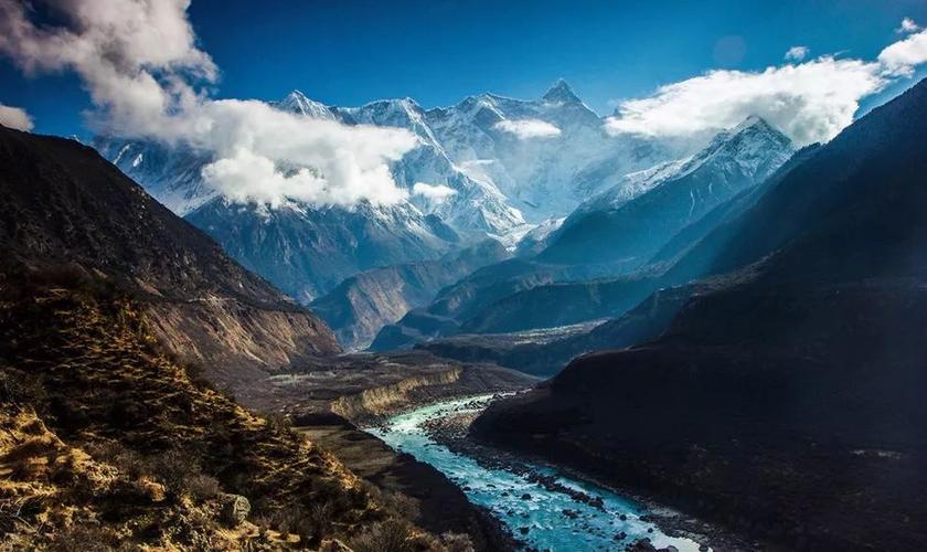 雅魯藏布江大峽谷兩側(cè),壁立高聳的南迦巴瓦峰(海拔7782米)和加拉白壘峰(海拔7234米),其山峰皆為強烈上升斷塊,巍峨挺拔,直入云端。峰嶺上冰川懸垂,云霧繚繞,氣象萬千。
