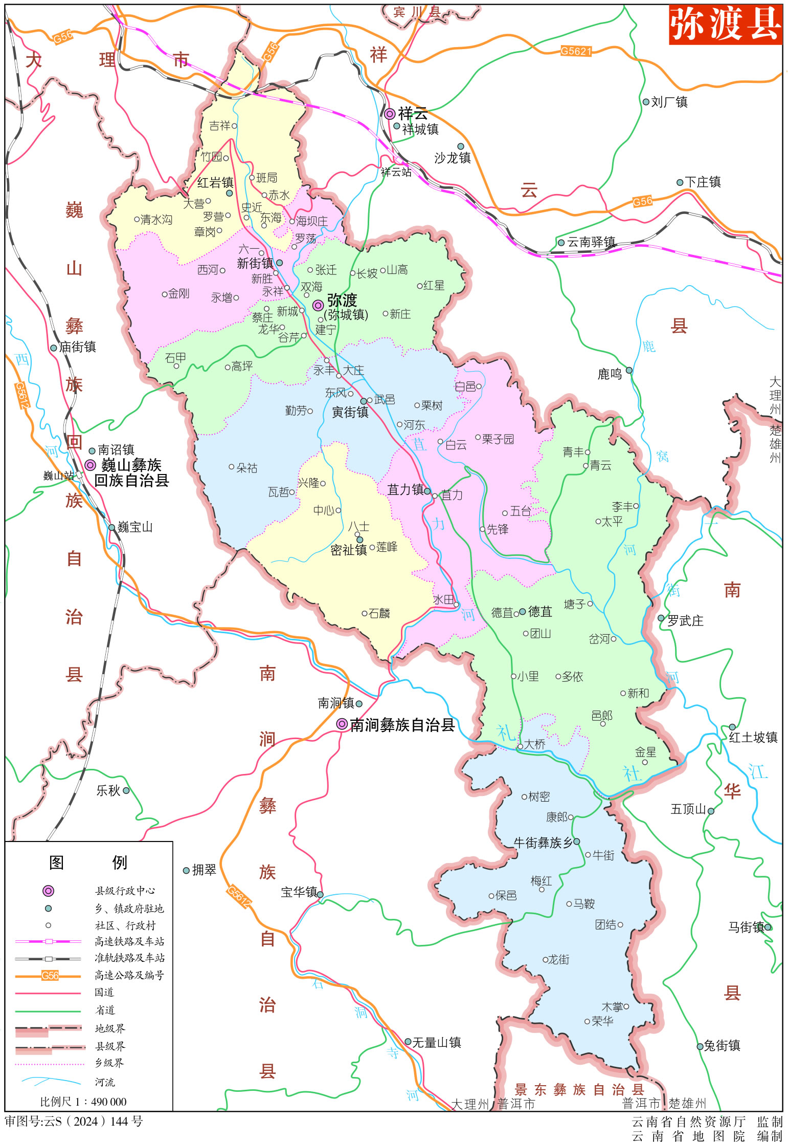 國道214線、320線交匯境內(nèi),廣大鐵路、昆瑞高速公路和祥臨高速公路穿境而過,縣城彌城鎮(zhèn)距省會昆明市332公里,距州府下關(guān)61公里。