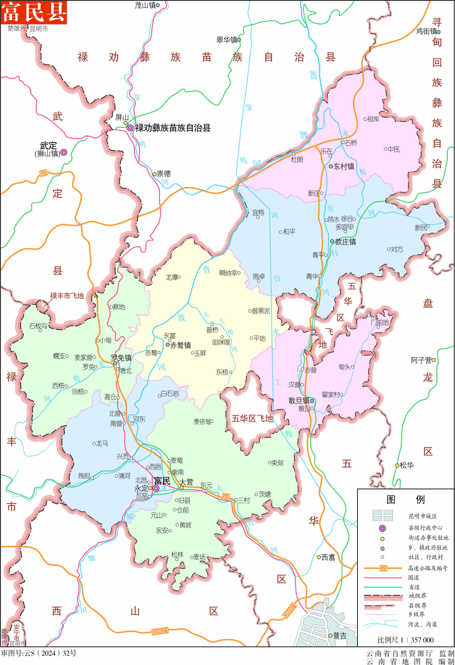 位置境域 富民縣,位于昆明主城區(qū)西北部,東鄰嵩明縣、尋甸縣相鄰,北與祿勸山水相連,西與祿豐、武定接壤,南靠西山區(qū)。南北長51.6千米,東西寬44.2千米,總面積993平方千米。