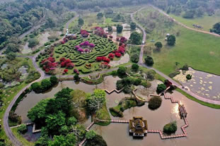 百花園為中國科學(xué)院西雙版納熱帶植物園的第一景,占地面積353畝,現(xiàn)收集保存與展示熱帶花卉植物645種(品種)。百花園植物布景主要采用孤植、純林大片種植、同類多品種集中收集、?茖俦4、攀緣及水生花卉植物多種方式展示。并力求與地形水域巧妙結(jié)合,形成不同的賞景空間,創(chuàng)造“天女散花”、“層林盡染”、“五彩繽紛”和“花開花落”等景觀效果。借助區(qū)內(nèi)大量花卉植物,通過挖掘花卉與人們?nèi)粘I、信仰和情感的關(guān)聯(lián),以及古往今來的文人墨客以花卉植物創(chuàng)作出的傳說故事、詩歌等文學(xué)作品,以對聯(lián)、字畫、牌匾等形式展示于園區(qū)內(nèi),充分展示花卉植物的科學(xué)和文化內(nèi)涵。
