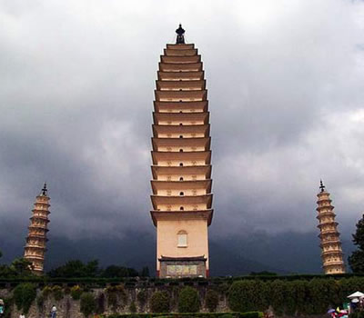 三塔相傳建于南詔保和時期,三塔之旁原有規(guī)模宏大的崇圣寺。據(jù)《南詔野史》、《自古通記》等史籍記載,寺基方7里,建于南詔第十主豐佑,保和十年至天啟元年(公元834至840年)。經(jīng)歷了千年滄桑和風(fēng)雨剝蝕,崇圣寺終毀于清咸豐年間,如今惟留三塔。近年來曾在塔頂發(fā)現(xiàn)南詔、大理中時期的重要文物600余件。