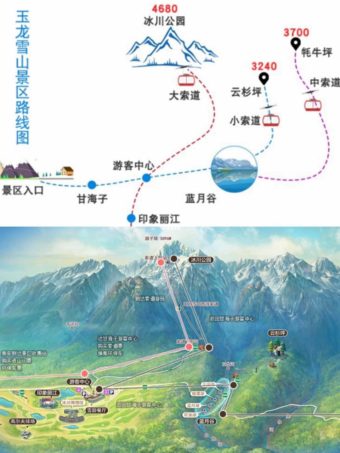 玉龍雪山冰川公園是觀賞“白水一號”現(xiàn)代冰川的最佳位置,游覽冰川公園可乘坐玉龍雪山旅游索道,該索道是通往冰川公園,涉足皚皚雪域,游覽“綠雪奇峰”的唯一通道,從海拔3356米處提升至玉龍雪山主峰扇子陡正下方海拔4506米處,索道全長2911米,垂直高差1150米。沿途可觀賞垂直帶自然景觀,遠眺甘海子、白水河、牦牛坪、云杉坪等景點。
