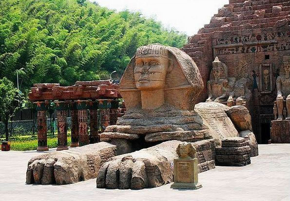 漫漫黃沙中,那宏偉的建筑,依稀就是魂牽夢繞已久的胡夫大金字塔和守護它數千年的獅身人面像;燥熱暖風里,法老們古老的咒語,斷斷續(xù)續(xù)飄來,召喚著我們不由自主的向前,渴望一探究竟。坐上埃及的太陽船,穿過金字塔黑暗的甬道,危險的鬼屋,劈波斬浪的剎那,才發(fā)現(xiàn)早已沉醉在古埃及異度時空的迷夢中。