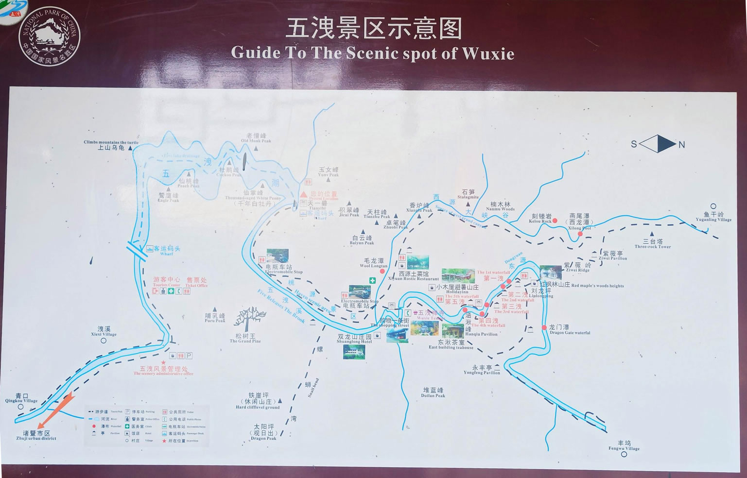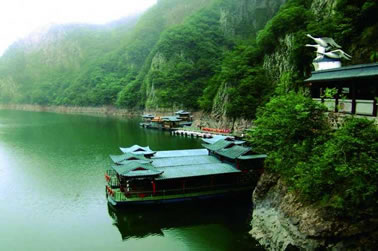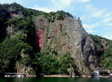 由紫藤長(zhǎng)廊拾階登上壩頂,眼前展現(xiàn)的是一湖靜水,綠水蕩漾,深不可測(cè)。 水面上疾駛的游船,不時(shí)激起層層漣漪,把兩岸的元寶峰,鷲鷹峰,仙桃峰、杜鵑峰、老僧峰、仙掌峰等山峰的倒影彎折。 泛舟湖上,水鳥(niǎo)在水面低飛,狹長(zhǎng)的湖面見(jiàn)不到盡頭,大有“青山綠水景無(wú)盡”之感,又有“一折青山一扇屏,一彎綠水一古琴”的詩(shī)意。沿湖兩邊,蔥蘢俊秀,美不勝收。春天萬(wàn)木崢嶸,紅杜鵑從綠樹(shù)叢中透出;夏天滿山蔥郁,濃蔭蔽日;一到秋冬季節(jié),蒼黃的銀杏葉和紅艷的楓葉,點(diǎn)綴在一片蕭瑟之中。