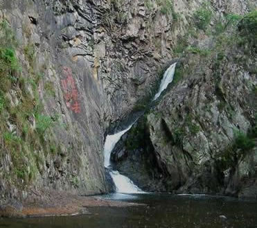 雙龍出海第二洩:二洩緊接一洩,落差為7.1米。瀑布下落時(shí),被一塊兀石分成兩半,分流如珠簾飄動(dòng),開(kāi)朗而又深沉,又如雙龍出游不知天高地厚,古人有詩(shī)贊其曰:兩龍爭(zhēng)壑不知應(yīng),一石橫空不渡人。