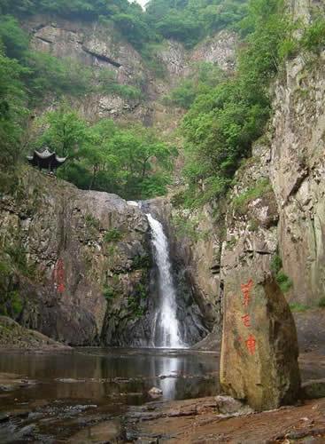 月籠輕紗第一洩:水流從石河瀉下,瀑布小巧平緩,柔美如月籠輕紗,雋永奇秀,“樂(lè)聲幽咽,萬(wàn)松颯然,隔岸秋花爛漫,禽聲甚樂(lè)”,瀑布中間有一水潭,直徑1.5米,口微向內(nèi)收,四壁光滑,深不見(jiàn)底,人稱“小龍井”,俗呼小腳桶潭,是人工開(kāi)鑿還是天然形成,還是一個(gè)謎,古人贊其曰:龍井鑿石灘,園勻如截竹;登波落纖埃,照見(jiàn)須眉綠。