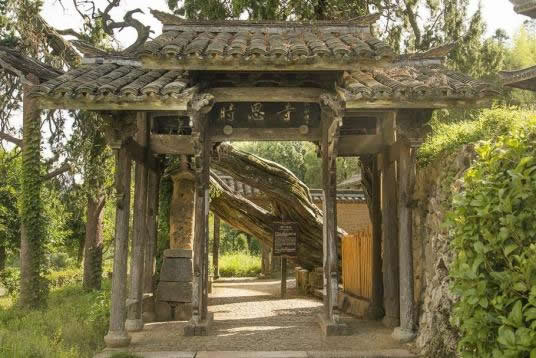 進(jìn)了山門,邁上幾級臺階,有一個黃土砂礫鋪筑的小天地,右側(cè)有石臺階,通向枝桿蒼虬的柳杉王;左側(cè)是下坡道,通向時思寺的鐘樓與大殿;迎面是一堵砂石黃泥壘筑的儀門,通向梅氏宗祠。